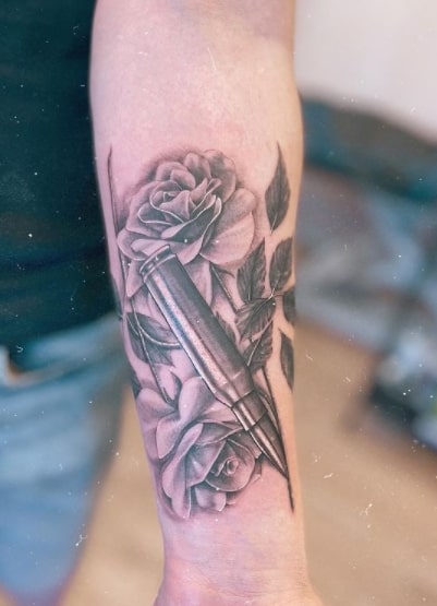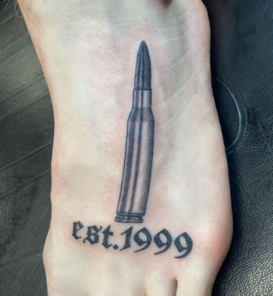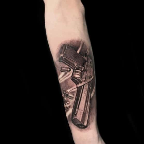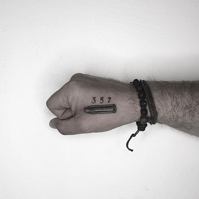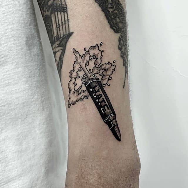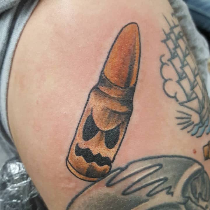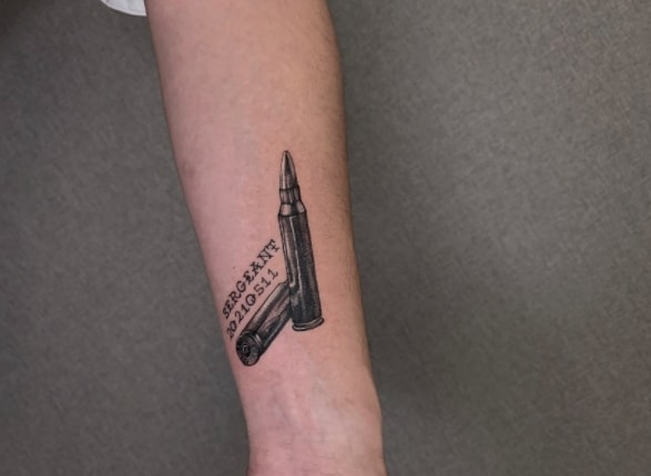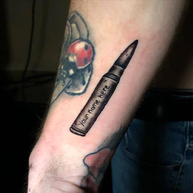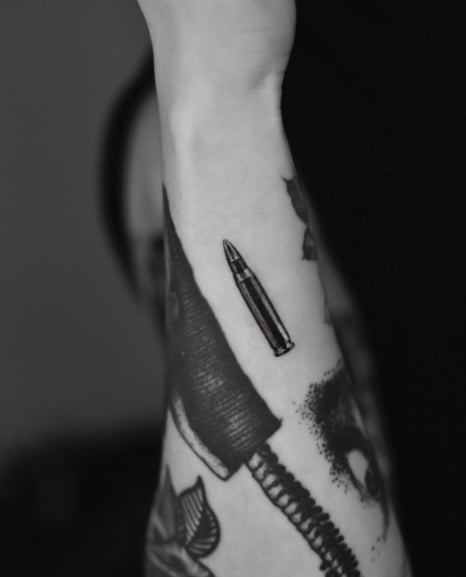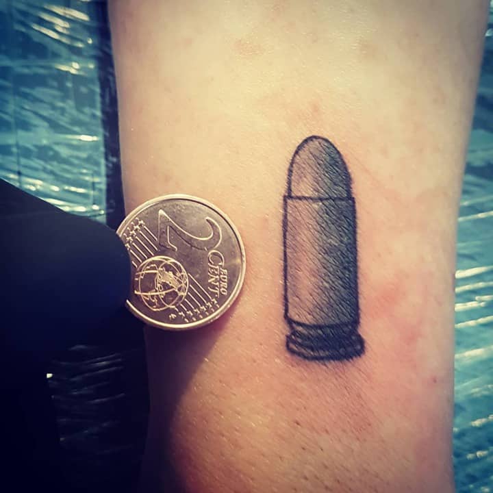 Тату куля, патрон або гільза відносяться до військової символіки. Вперше такі малюнки на своє тіло наносили саме воїни. Вважалося, що зображення кулі лякало ворога. Вони використовували її в якості натільного оберега, що забезпечує потужний захист. Згодом символ отримав більш широке значення. Наприклад, сьогодні багато хто ставиться до такого малюнку як до певного знаку, що приносить удачу під час полювання.