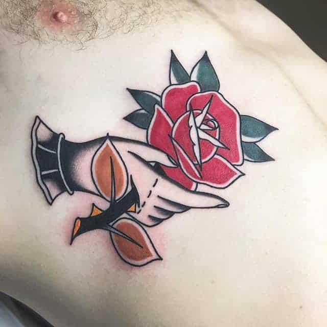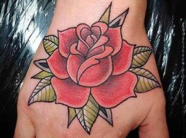 Чоловічі зображення з квіткою переважно чорно-білі. Цікаво виглядає намальована в ромбі або трикутнику татуювання троянда на руці. Чоловіче татуювання може доповнюватися новими елементами, що в цілому складе оригінальний рукав з рослиною. Роза на кисті в основному зустрічається в реалізмі або в стилі нью скул.