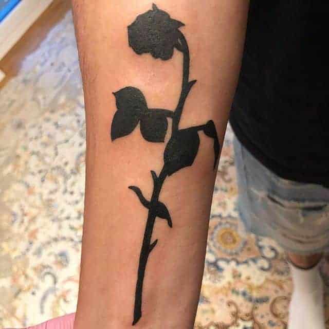 Чорний колір символізує смуток, печаль, жаль про втрачену любов. У той же час чорна троянда буде позначати відданість, романтику і надію на відновлення відносин і почуттів. Може бути просто контурна картинка або повністю зафарбована. У деяких випадках такий малюнок може бути знаком смерті, особливо в перевернутому вигляді – це більш властива тема для субкультур, наприклад Готів.