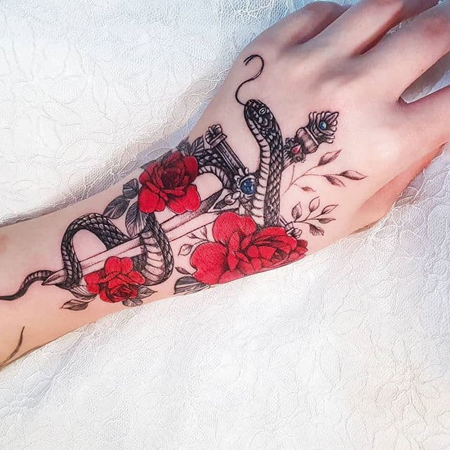 Для дівчат на руці значення має стиль і колірна гамма малюнка. Підійдуть кольорові варіанти, наприклад червона троянда тату в реалізмі або акварелі.