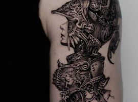 Нерідко татуювання наноситься на груди, лопатки, плечі. Рідше зустрічаються ескізи з лицарем на нозі. Колірна гамма у більшості малюнків схожа: переважають чорно-білі, різнокольорові або червоно-коричневі відтінки. Замовте неповторний ескіз у салоні Альянс у Києві.