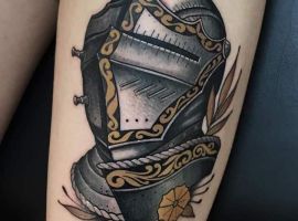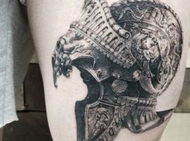 Татуювання з лицарями, вершниками на конях, грецькими спартанцями досить популярні у чоловічої статі. Але, звичайно, ті, хто хоче обзавестися стильним і неординарним зображенням, яке підкреслить силу і мужність, навряд чи виберуть цей стандартний ескіз. Інша справа – це татуювання шолом спартанця. Воно передає сенс основного зображення, тобто дозволяє наблизитися до образу хороброго і мужнього воїна, проте виглядає цікавіше. Майстри нашого тату салону з радістю зроблять для вас таке тату.