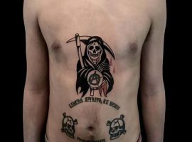 - бути на волосині від смерті. Також татуювання із зображенням “смерті з косою” набивають люди, які дивом вижили і мало не зустріли на своєму шляху кістляву стару. Наприклад, людина потрапила в серйозную аварію і залишилась живою.