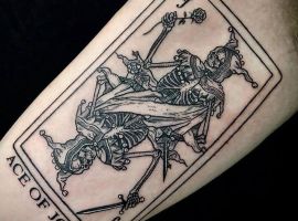 Зазвичай, татуювання меча – це ознака шаленої сили, благородства і лідерства. Він майже ніколи не тягне за собою ніяких негативних характеристик. Але все ж зображення кістлявої Старої в капюшоні, що тримає в руці меч, не можна трактувати, як веселе і позитивне татуювання. Вона має ті ж позначення, що і татуювання “смерті з косою”. Можна створити неповторний ескіз разом із майстром салону Альянс у Києві.