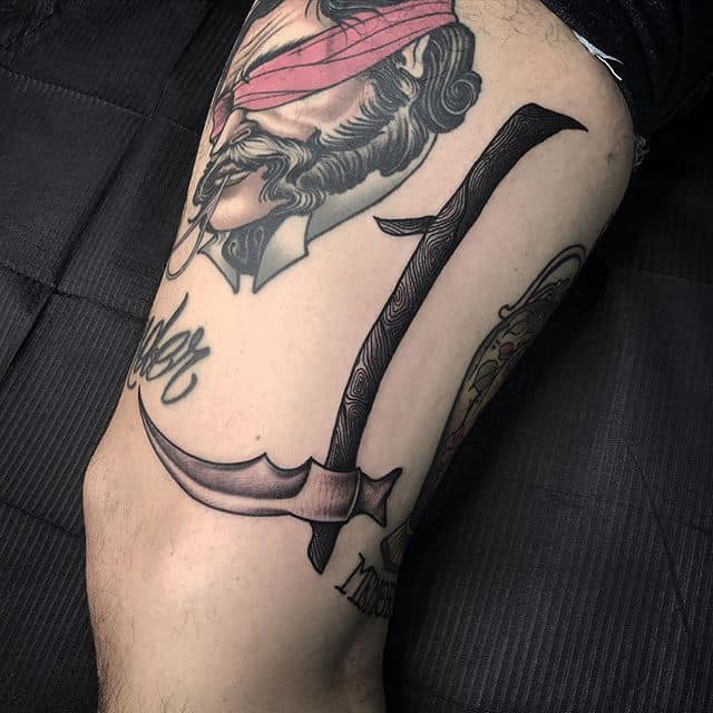 Зазвичай, татуювання меча – це ознака шаленої сили, благородства і лідерства. Він майже ніколи не тягне за собою ніяких негативних характеристик. Але все ж зображення кістлявої Старої в капюшоні, що тримає в руці меч, не можна трактувати, як веселе і позитивне татуювання. Вона має ті ж позначення, що і татуювання “смерті з косою”. Можна створити неповторний ескіз разом із майстром салону Альянс у Києві.