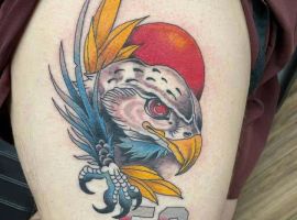 Тату з соколом в стилі нео-традиції дозволяють використовувати широку колірну палітру при чітко впізнаваних контурах, що окреслюють силует сокола. У цьому стилі можна дозволити вільне трактування колористичних рішень, надаючи додаткові акценти тату і значення кольору. Такі незвичайні тату сокола підійдуть дівчатам, так як зображення птахів можна органічно поєднувати з квітами і райдужним сяйвом. Ще один плюс техніки – об’ємність, яка може передати виразність погляду хижого птаха.
