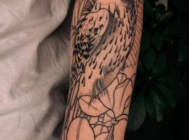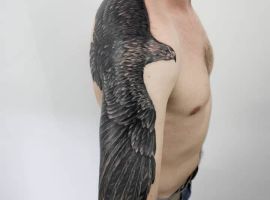 Ще один спосіб оригінального виконання тату з соколом – розміщення на таких ділянках, де є можливість створити ефект руху крил птиці. В цьому випадку доведеться потерпіти через хворобливе нанесення в області суглобів, зате Сокіл на тату буде, як справжній. Рекомендована техніка нанесення – реалізм в кольоровому або чорно-білому варіанті.