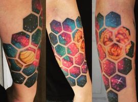 Дуже стильно виглядають соти в чорно-білому графічному варіанті. Але і в яскравих кольорових техніках теж можна оригінально втілити таку ідею, зобразивши всередині сот якийсь цікавий фон, наприклад, космос. Майстри студії Альянс у Києві створять для Вас ескіз.