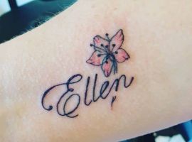 Квіти. Безумовно, таку ідею частіше вибирають собі дівчата Вони можуть бути абсолютно різними, хоча в основному вибирають лаванду, лотос, півонія, сакуру, лілію, нарцис, фіалку, троянду. Найулюбленіша жіноча версія, коли слово зображується у вигляді стебла. Малюнок може бути як чорно-білий, так і в кольоровому форматі.