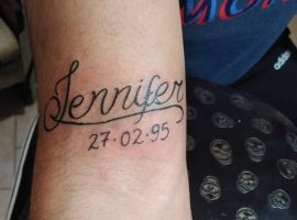 2. Татуювання ім’я дитини символізує зазвичай любов і щастя від появи спадкоємців. Звичайно ж, така подія дуже радісна і значуща для кожної людини. А відобразити назавжди в пам’яті цей день – дуже цікава і оригінальна ідея. Хоча сам факт нанесення малюнка на своє тіло стереотипно вважати безрозсудним, але ім’я дитини може сказати навпаки про відповідальність і готовність до цього. Найпопулярніший варіант – ім’я та дата народження дитини – сина або дочки. Часто поруч з дитячим ім’ям набивають ще й імена або ініціали батьків. Цікава також версія може бути з родовим деревом, де будуть відзначені практично всі члени сім’ї по обидва боки. Більш складним, але не менш оригінальним може бути поєднання з тату в реалізмі. Це може бути як портрет по фото, так ручка немовляти, її відбиток.