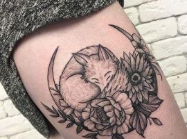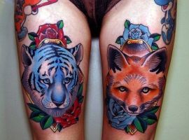 - Лисиця. Значення такого тату на стегні буде залежати виключно від ставлення дівчини до цієї тварини.
