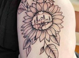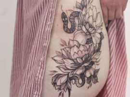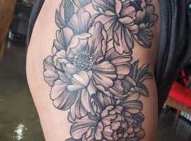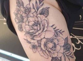 Тату з квітами на стегні найцікавіше виглядають в таких стилях, як Графіка, Акварель, Дотворк, Реалізм, Нью Скул.