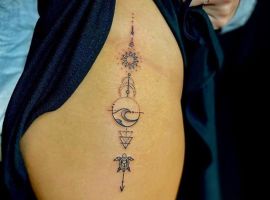- правильно підібраний ескіз для тату на стегні може візуально витягнути ніжку, зробивши її більш стрункою і приховавши повноту.