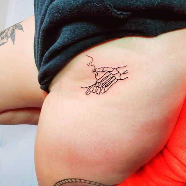 - при необхідності, татуювання легко можна приховати під одягом. Така перевага буде істотною для дівчат, чия робота вимагає суворого зовнішнього вигляду, стриманого образу. Тату на стегнах легко можна заховати під спідницею або під брюками. При цьому бути яскравими і виділятися серед інших, наприклад, можна в купальнику або поза роботою.