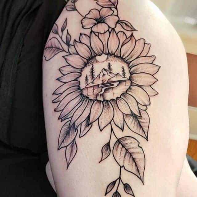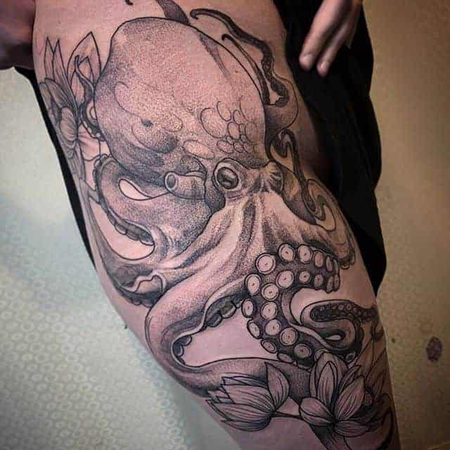 Тату з квітами на стегні найцікавіше виглядають в таких стилях, як Графіка, Акварель, Дотворк, Реалізм, Нью Скул.