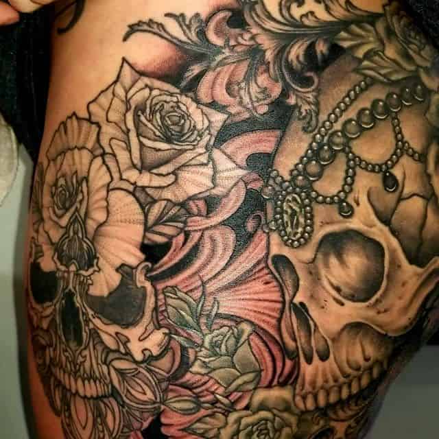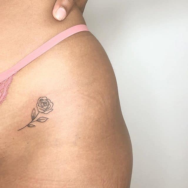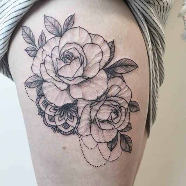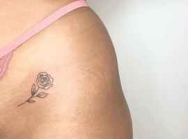 Такий натільний малюнок виглядає дуже жіночно і зачаровує. За значенням, найчастіше це може бути символ гордості, розкоші, любові, жіночої краси. Цікаво, що значення тату троянда на стегні може змінюватися в залежності від колірної гами ескізу. Так, червона квітка-це безумовно знак любові, пристрасті, білий – чистота, невинність, чорний – туга, розчарування, а синій – благородство, недосяжність.