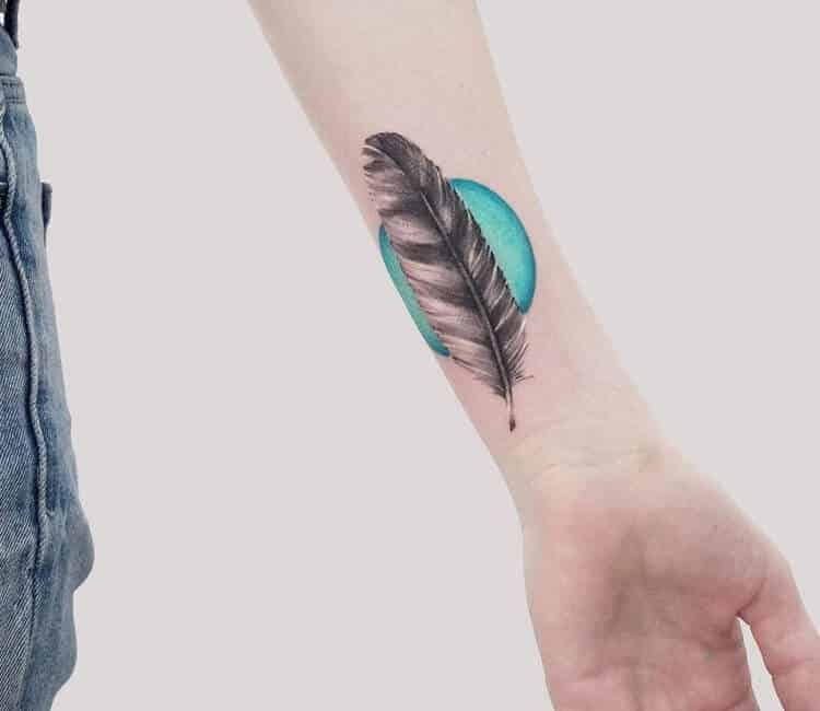 Популярна ідея тату з пером. Зазвичай у цей малюнок жінки вкладають тату значення польоту, легкості, непокори, свободи та цінність особистого простору.
