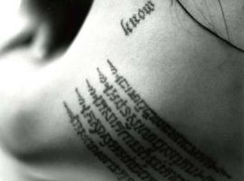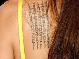 Камбоджійський текст, виконаний в традиційній техніці, захисний. Анджеліна, захоплена культурою і звичаями азіатської країни, зробила тату на лопатці, щоб захистити себе і усиновленого хлопчика Меддокса від бід і злих сил.