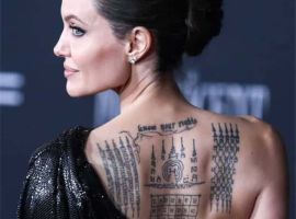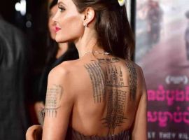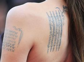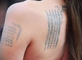 Актриса зробила тату на лівій лопатці в 2002-му, коли перебувала в Камбоджі. Там вона усиновила першу дитину – Камбоджійського хлопчика.