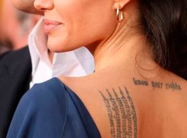 Там, де раніше красувався японський ієрогліф, тепер знаходиться буддійська молитва. Актриса зробила тату на лівій лопатці в 2002-му, коли перебувала в Камбоджі. Тоді Джолі ще не познайомилася з Піттом, але усиновила першу дитину – Камбоджійського хлопчика, який народився роком раніше.