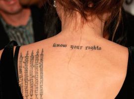Фраза “Знай свої права”. Напис “Know your rights”, горизонтально накреслений середньовічним шрифтом нижче потилиці, – назва пісні, виконуваної улюбленим музичним колективом Анджеліни.