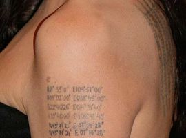 Там, де красувалося посвячення Торнтону, Джолі зробила тату з географічними координатами місць, де народилися колишній чоловік Бред Пітт і їхні діти. Для зірки це татуювання на видному місці найбільш значуще.