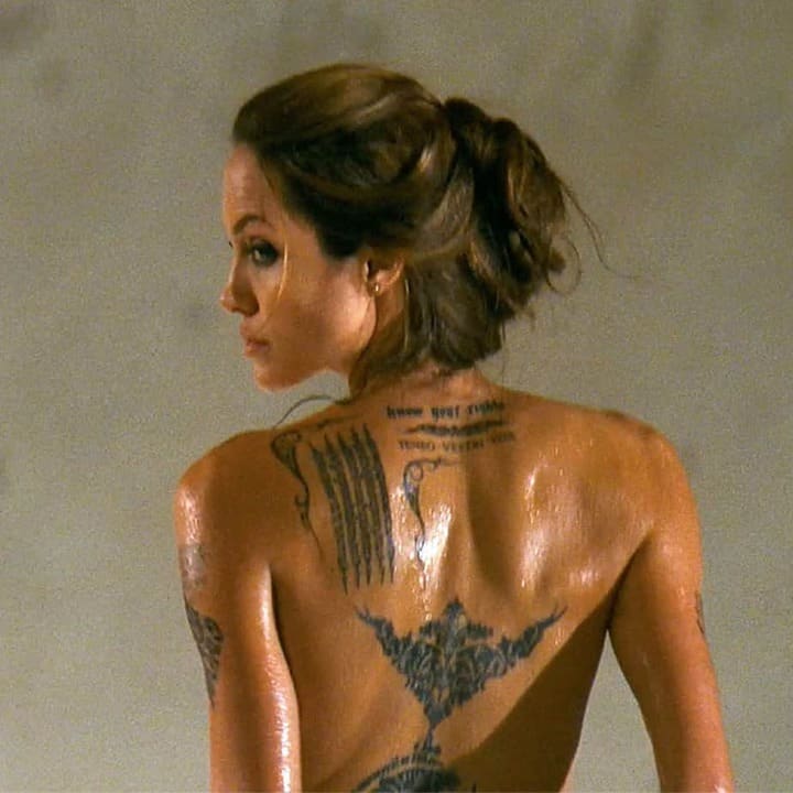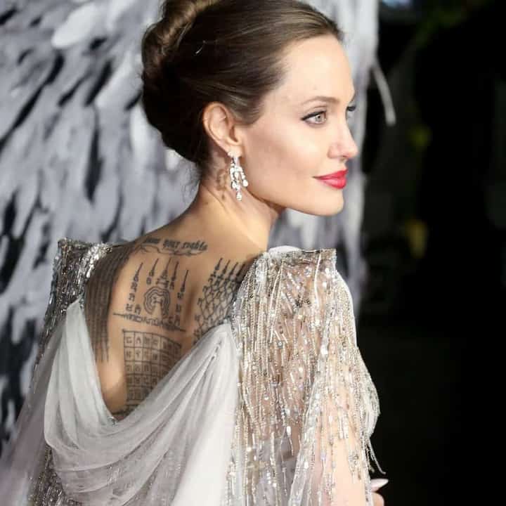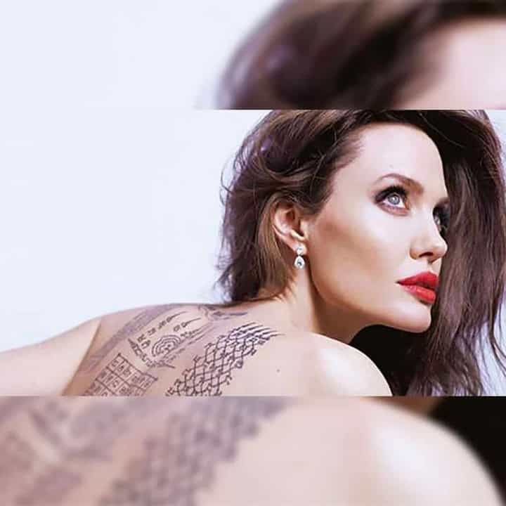 Актриса зробила тату на лівій лопатці в 2002-му, коли перебувала в Камбоджі. Там вона усиновила першу дитину – Камбоджійського хлопчика.