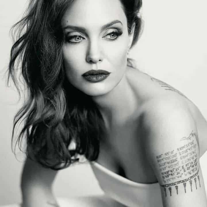 Там, де красувалося посвячення Торнтону, Джолі зробила тату з географічними координатами місць, де народилися колишній чоловік Бред Пітт і їхні діти. Для зірки це татуювання на видному місці найбільш значуще.