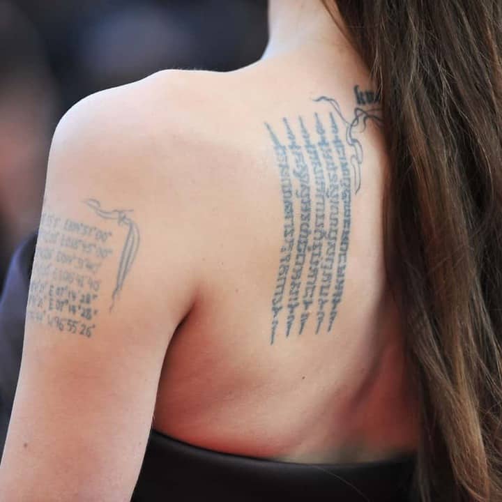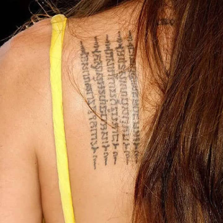Там, де раніше красувався японський ієрогліф, тепер знаходиться буддійська молитва. Актриса зробила тату на лівій лопатці в 2002-му, коли перебувала в Камбоджі. Тоді Джолі ще не познайомилася з Піттом, але усиновила першу дитину – Камбоджійського хлопчика, який народився роком раніше.