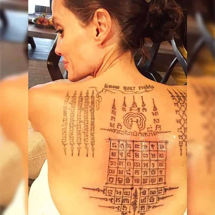 Найбільші татуювання Джолі знаходяться на спині. Священне Тайське татуювання “Сак Янт” зобразив колишній чернець, а нині знаменитий тату-майстер Аджарн Ноо Канпай. Він прилетів до Камбоджійського Сіемреап з Бангкока спеціально заради надання послуги голлівудській знаменитості.