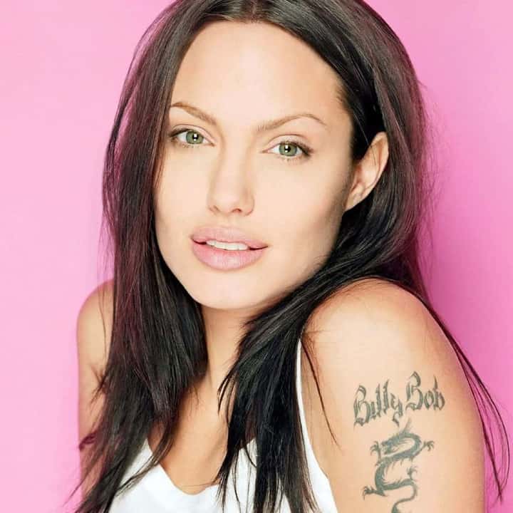 Роман з Біллі Торнтоном у Джолі був бурхливий, пристрасний. Саме тоді Анжеліна, на 20 років молодше коханого, всерйоз захопилася прикрасою тіла тату. Вступивши в шлюбний союз, юна актриса заради приколу вирішила закріпити пам’ять про подію: на лівому плечі зобразила дракона в китайському стилі, а під ним – ім’я коханого.