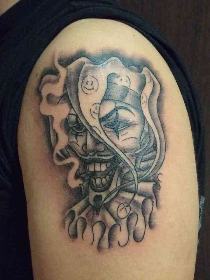 На думку майстрів, татуювання з зображенням клоуна або блазня успадковує давню традицію, що об’єднує такі символічні образи, як простак (або особа, що вдає простака), татуювання блазень (кмітливий пустун) і буффон (мандрівний комедіант). Ці категорії часто змішувалися в образ дурня, якому в давнину надавалося досить похмуре значення. Дурень, блазень, арлекін являв собою інверсію правителя і часто заміняв собою останнього в ритуалах жертвопринесення.