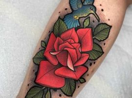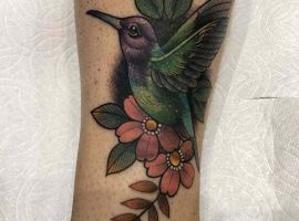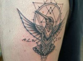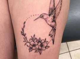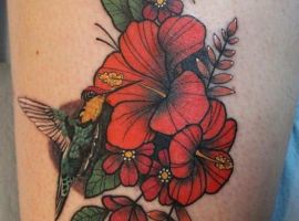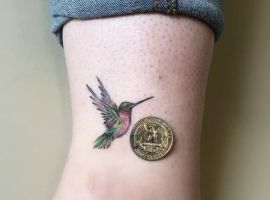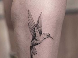 Тату колібрі на нозі. Популярний у світі варіант. Класно виглядає і на стегні, і на ікрі, і на щиколотці. Відмінно підійде для того, щоб закрити старі операційні шрами – крихітні розміри птиці дозволяють набити образ зі збереженням природних розмірів птиці. Тату колібрі на стегні може стати справжнім витвором мистецтва.