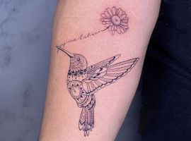 Тату колібрі з квіткою, що харчується нектаром. Символізує невинність і чарівність.