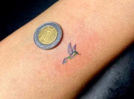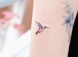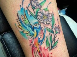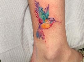 Фото татуювань з крихітною пташкою доводять, що найбільш вигідно виглядають зображення в акварельному стилі. Мабуть, важко відшукати більш відповідний по насиченості і позитивності стиль, ніж акварель. У ньому імітується робота фарбами на водній основі. Образ прикрашається патьоками фарби для додання реалізму і створення відчуття, що зображення намальовано легкими мазками акварелі.