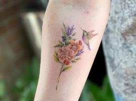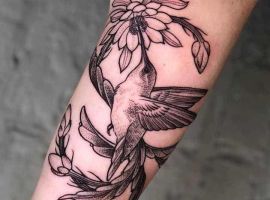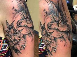- Тату колібрі з квіткою, що харчується нектаром. Символізує невинність і чарівність.