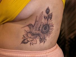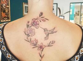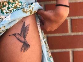 Тату колібрі на лопатці вигідно доповнить пляжний образ і подарує впевненість у своїх силах.