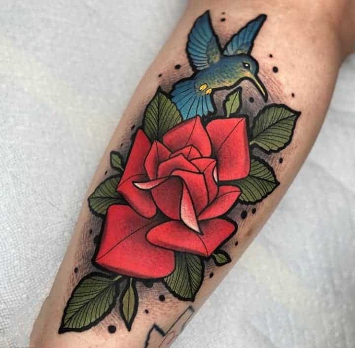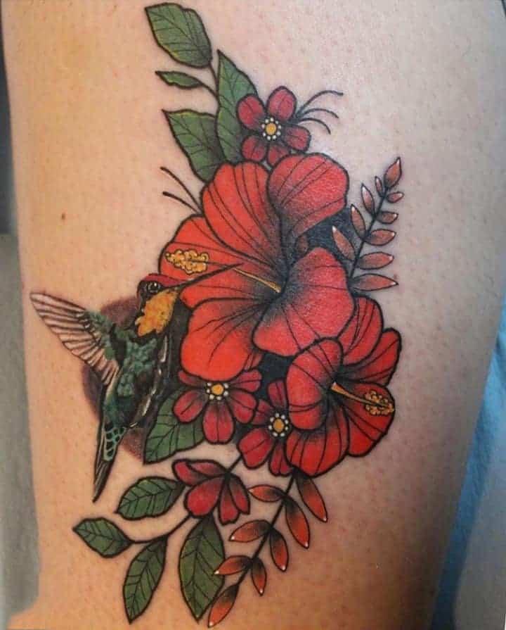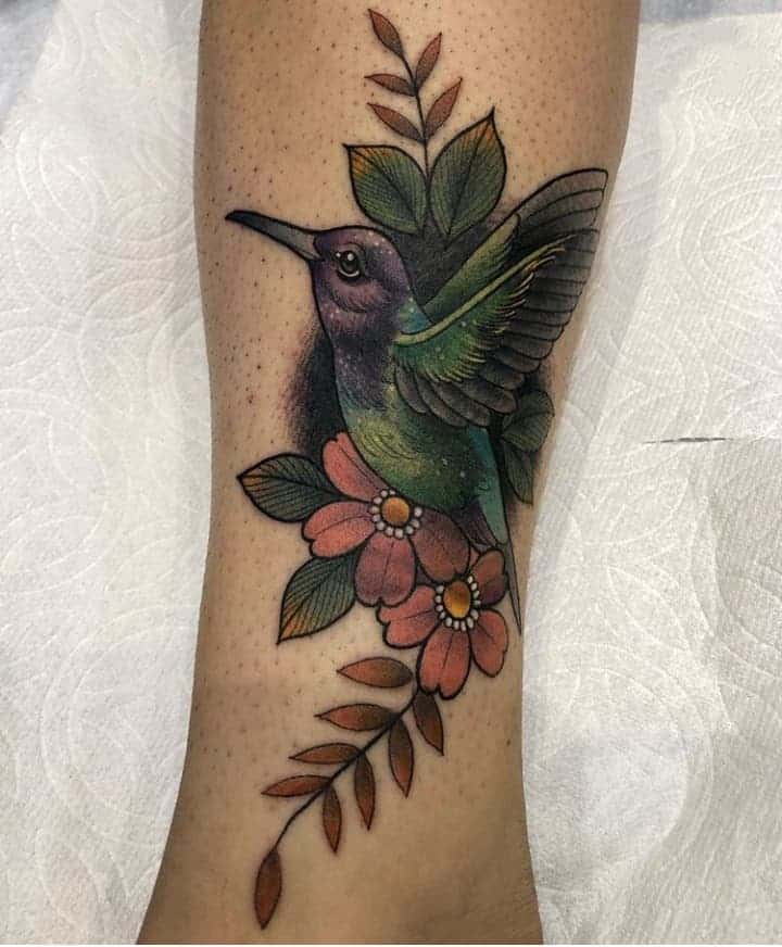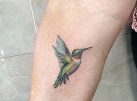 Тату колібрі на нозі. Популярний у світі варіант. Класно виглядає і на стегні, і на ікрі, і на щиколотці. Відмінно підійде для того, щоб закрити старі операційні шрами – крихітні розміри птиці дозволяють набити образ зі збереженням природних розмірів птиці. Тату колібрі на стегні може стати справжнім витвором мистецтва.