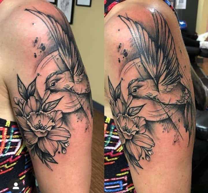 Тату колібрі на плечі. Цей варіант дозволяє витатуювати детальний малюнок з написом, що передає ваше життєве кредо.