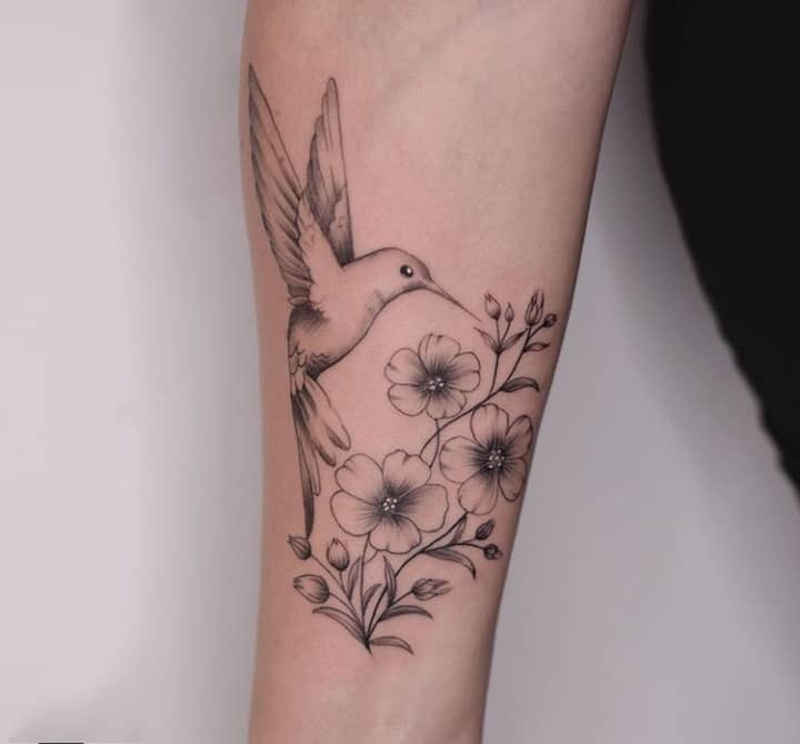 Тату колібрі з квіткою, що харчується нектаром. Символізує невинність і чарівність.
