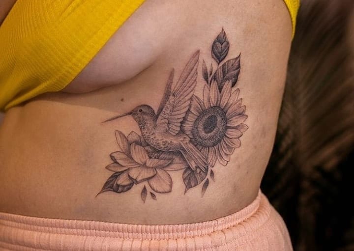 Тату колібрі на лопатці вигідно доповнить пляжний образ і подарує впевненість у своїх силах.