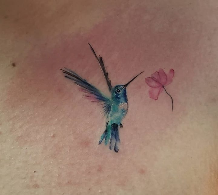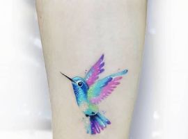Фото татуювань з крихітною пташкою доводять, що найбільш вигідно виглядають зображення в акварельному стилі. Мабуть, важко відшукати більш відповідний по насиченості і позитивності стиль, ніж акварель. У ньому імітується робота фарбами на водній основі. Образ прикрашається патьоками фарби для додання реалізму і створення відчуття, що зображення намальовано легкими мазками акварелі.