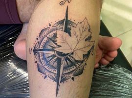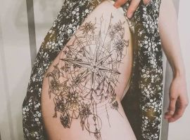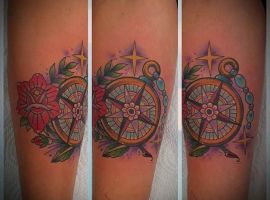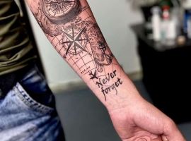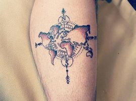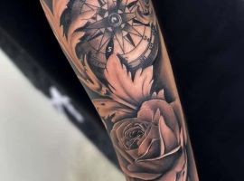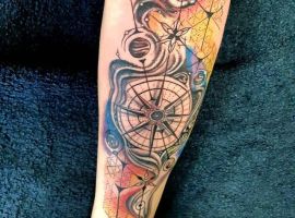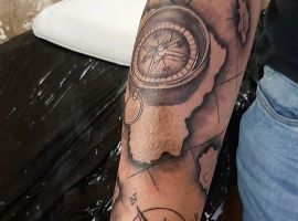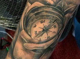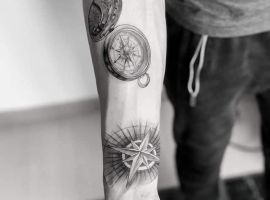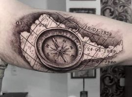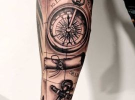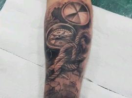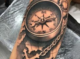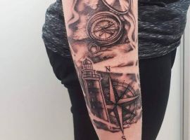- Магнітний, новий тип зображення характерний для значення татуювання компас в стилі “Роза Вітрів”. Ескіз цього позначення зображують з картами, кораблями або іншою морською атрибутикою. Компасу із зображенням годинника так само притаманний сучасний тип виконання наколки. Цей символ найбільш характерний для мореплавців і приналежних до морської професії людей. Він позначає свободу у виборі, бездоганність людської натури та вірність до другої половинки. Адже не дарма в народі кажуть:”вірний як компас”.