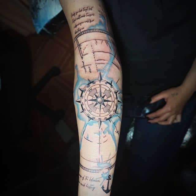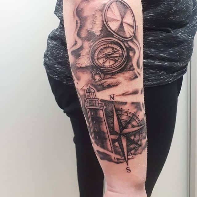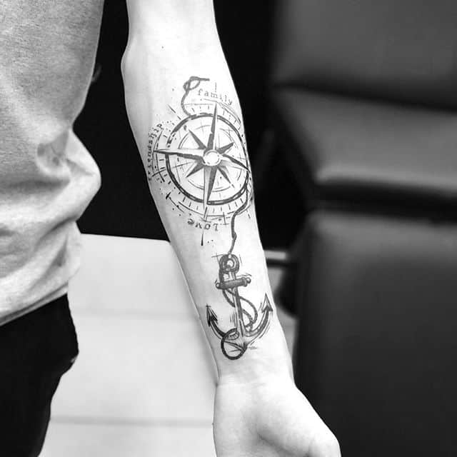 Тату компас на руці більш властивий хлопцям, вони полюбили цей знак за вірність, а якщо поруч з ним набити і якір то символічне позначення придбає новий сенс. Наприклад: компас тату на нозі разом з восьминогом означає всебічність розвитку людини, можливість досягти успіху в роботі й зайнятті декількома справами одночасно. Татуювання компаса з якорем уособлює для чоловіків сімейні пута та набуття свого місця в цьому світі.