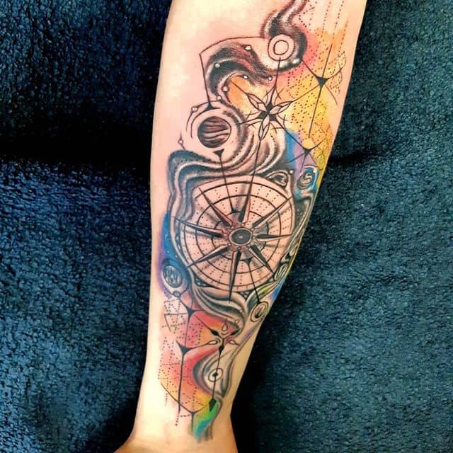 - Магнітний, новий тип зображення характерний для значення татуювання компас в стилі “Роза Вітрів”. Ескіз цього позначення зображують з картами, кораблями або іншою морською атрибутикою. Компасу із зображенням годинника так само притаманний сучасний тип виконання наколки. Цей символ найбільш характерний для мореплавців і приналежних до морської професії людей. Він позначає свободу у виборі, бездоганність людської натури та вірність до другої половинки. Адже не дарма в народі кажуть:”вірний як компас”.