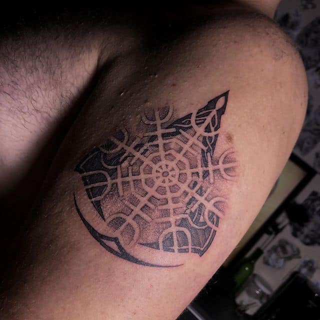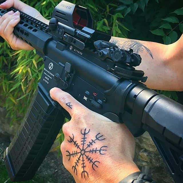 Другий символ вегвізир позначав “компас вікінгів” і зображається на лікті або наноситься на руку. Татуювання вегвізір в даному стилі в країнах Північної Європи наносилося на дерев’яні дощечки й таким чином могло охороняти свого господаря довгі роки. Адже дерево у вікінгів уособлювало душу людини, а тату компас на нозі вважався “живим”.