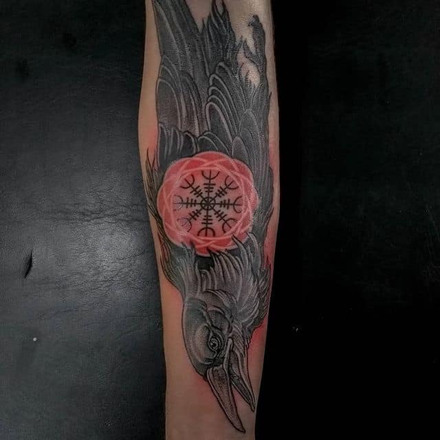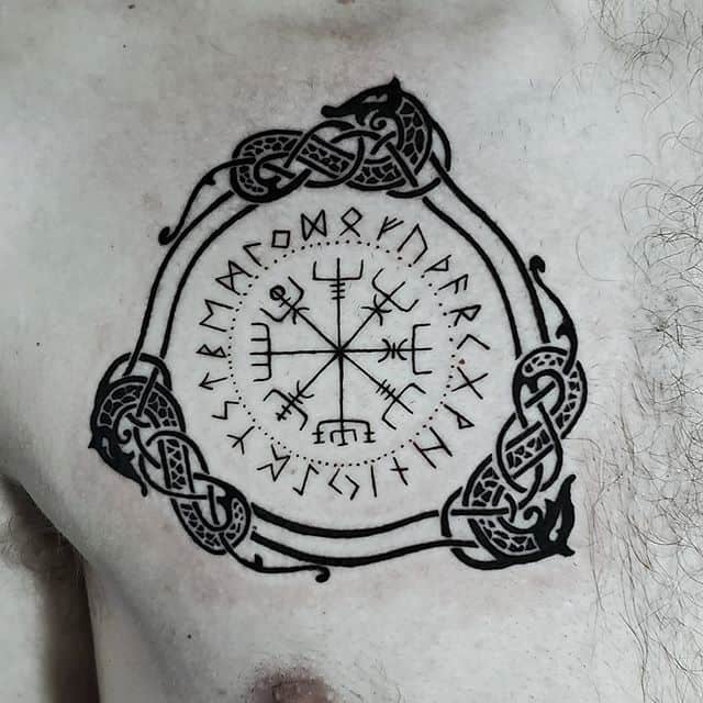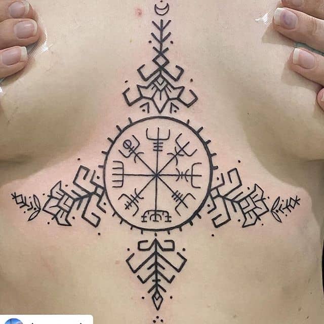 Дуже популярні два способи зображення компаса – у вигляді скандинавських рунічних зображень Vegvisir та Aegishjalmur (шолом жаху), що успадковані з історії Вікінгів. В не залежності від попередніх типів виконання тату компас на передпліччі часто зображують у вигляді скандинавського агісхьяльм або як рунічний вегвізир. Груди служить відмінною зоною для нанесення тату в стилі скандинавського мінімалізму.