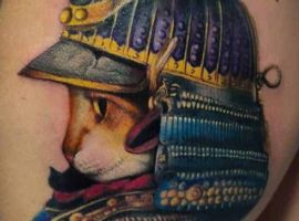 Кот зі зброєю зустрічається нерідко. Це може бути ніж, пістолет, автомат, граната та інші. Іноді набивають ще татуювання кіт в шоломі. Швидше за все виберуть їх люди, які хочуть показати, що за добротою і м’якістю ховається сила, сміливість і готовність постояти за себе.