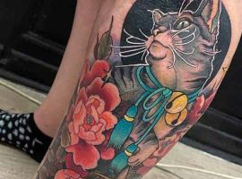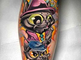 Чоловіки роблять татуювання кота на нозі, на плечі, лопатці, спині, литках, руках.