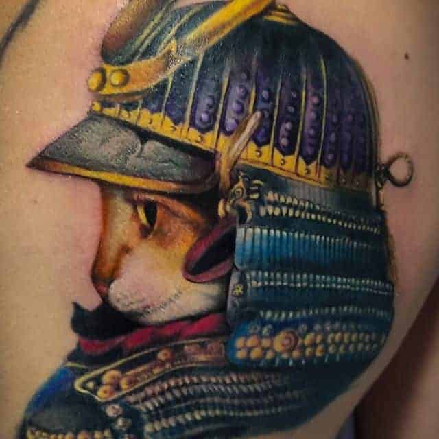 Кот зі зброєю зустрічається нерідко. Це може бути ніж, пістолет, автомат, граната та інші. Іноді набивають ще татуювання кіт в шоломі. Швидше за все виберуть їх люди, які хочуть показати, що за добротою і м’якістю ховається сила, сміливість і готовність постояти за себе.